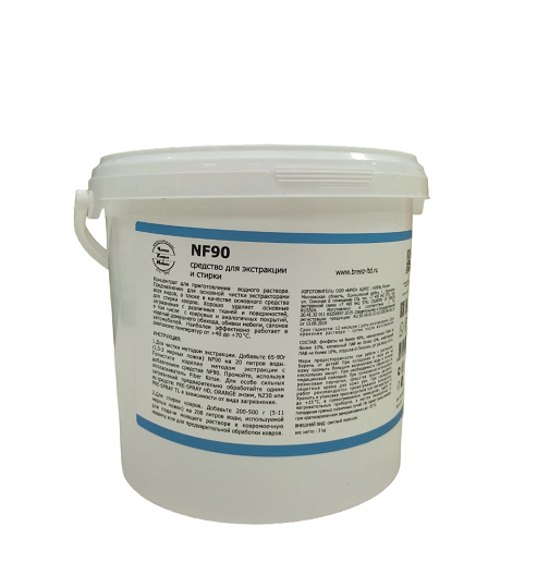 1.Для чистки методом экстракции. Добавьте 65-90 г (1,5-2 мерных ложки) NF90 на 20 литров воды. Почистите изделие методом экстракции с добавлением средства NF90. Промойте, используя ополаскиватель Fiber Rinse. Для особо сильных загрязнений предварительно обработайте одним из средств: PRE-SPRAY HD, ORANGE энзим или PRE-SPRAY TL в зависимости от вида загрязнения.