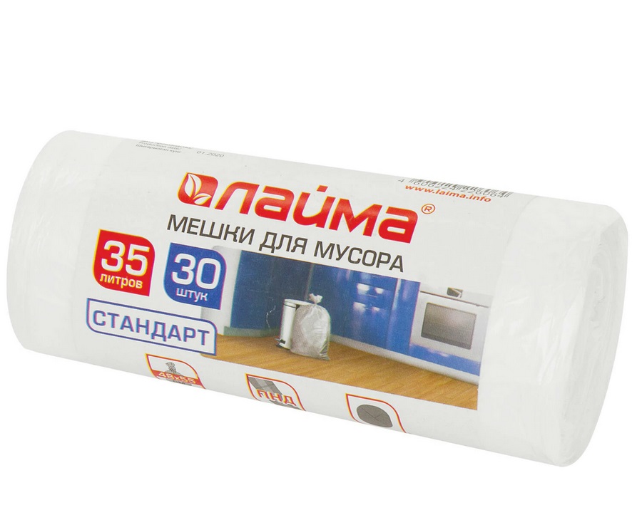 Мешки для мусора: 35л LAIMA ПНД, белые, 6мкм, 55*48см, 30шт/рул, 60рул/уп