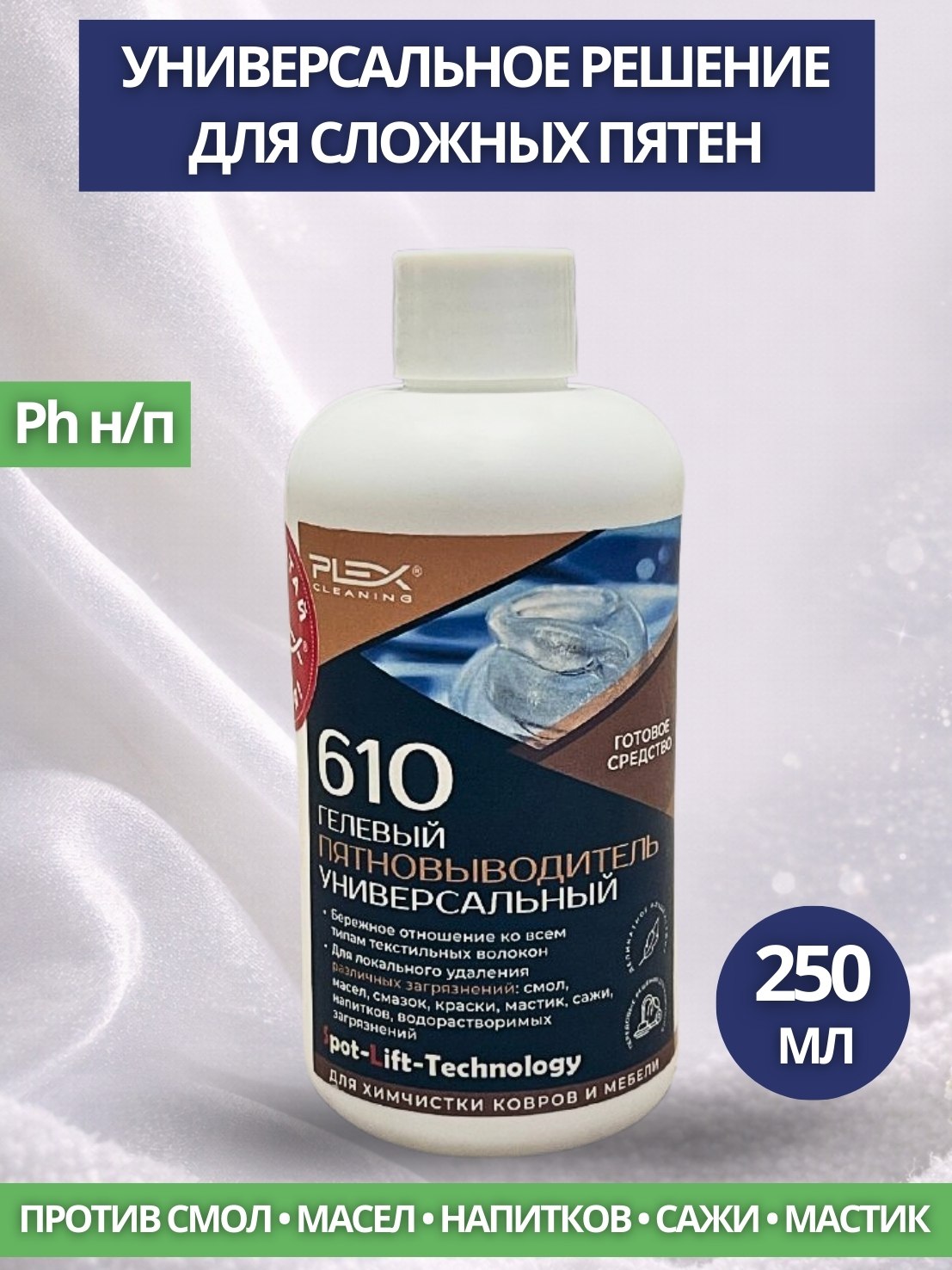 Пятновыводитель гелеобразный для эффективного удаления широкого спектра загрязнений, таких как смолы, масла, смазки, краски, мастики, сажа, напитки и иные водорастворимые загрязнения. Подходит для любых материалов, в том числе деликатных. Имеет слабый запах, что позволяет работать в помещениях с низкой кратностью воздухообмена.