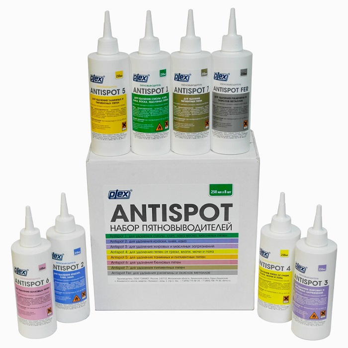 Antispot Fer На основе кислотных компонентов для удаления ржавчины и окислов металлов.Antispot 6 На основе щелочных компонентов. Для удаления пятен белкового происхождения: кровь, молоко, яйцо, мороженое,