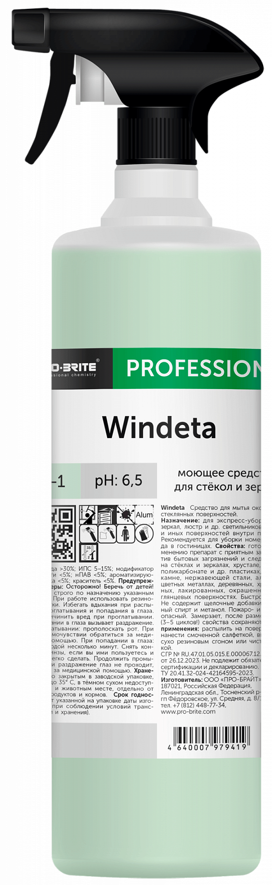 Pro-Brite: Windeta 1л/10шт триггер Cредство для стёкол и зеркал, готовый к применению препарат