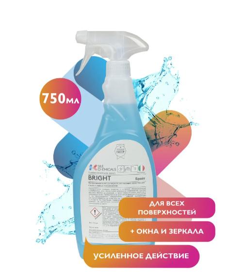 Bright - профессиональное моющее средство с отличной обезжиривающей способностью для стекла и всех моющихся поверхностей. Удаляет все типы жирных загрязнений, а также следы от дыма, никотина и шариковых ручек.