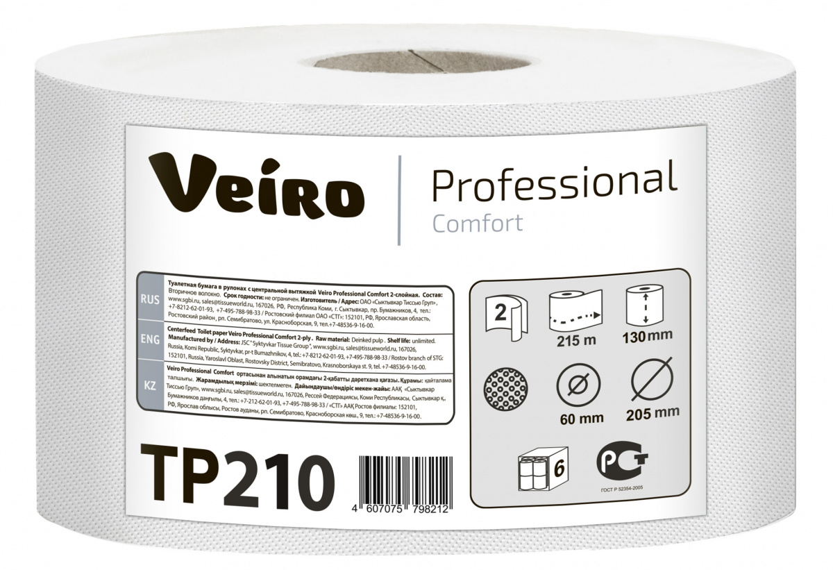 VEIRO: Т.Б. с центральной вытяжкой Professional Comfort 2сл, 130*215мм,6рул/уп, 215м.белая